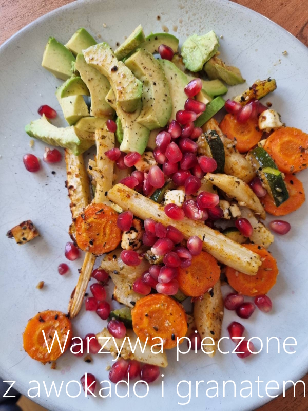 Na talerzu ułożyć półplasterki awokado, skropić octem balsamicznym, oprószyć solą i pieprzem. Obok ułożyć warzywa z serem, posypać ziarenkami granatu.